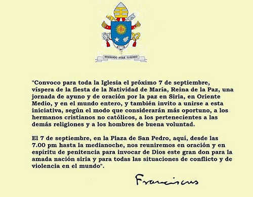 Como ya sabéis, el Papa Francisco ha convocado para el próximo sábado 7 de septiembre, una jornada de ayuno y oración por la paz en los países en conflicto bélico y, de modo particular, en Siria.