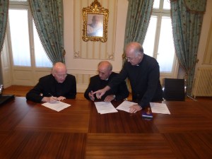 El pasado jueves 10 de octubre se firmó el convenio entre el Arzobispado de Burgos y la Región de España de la Prelatura del Opus Dei, en orden a la atención pastoral de la parroquia dedicada a San Josemaría Escrivá en nuestra ciudad. En el acto acompañaron a D. Francisco y a D. Ramón Herrando -Vicario Regional de la Prelatura para España-, representantes de la Curia Diocesana y de la Prelatura, además del párroco.