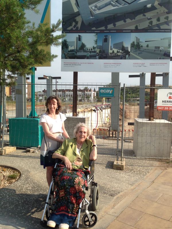 Beatriz y Virginia -de nuestro Voluntariado de Acompañamiento: No Estoy Solo/a (NES@)- se acercaron desde las Carmelitas Misioneras a visitar las obras del Complejo Parroquial y rezaron el Ave Maria recomendado a los que se acercan a la construcción. La foto está tomada por Soledad, voluntaria también de NES@.