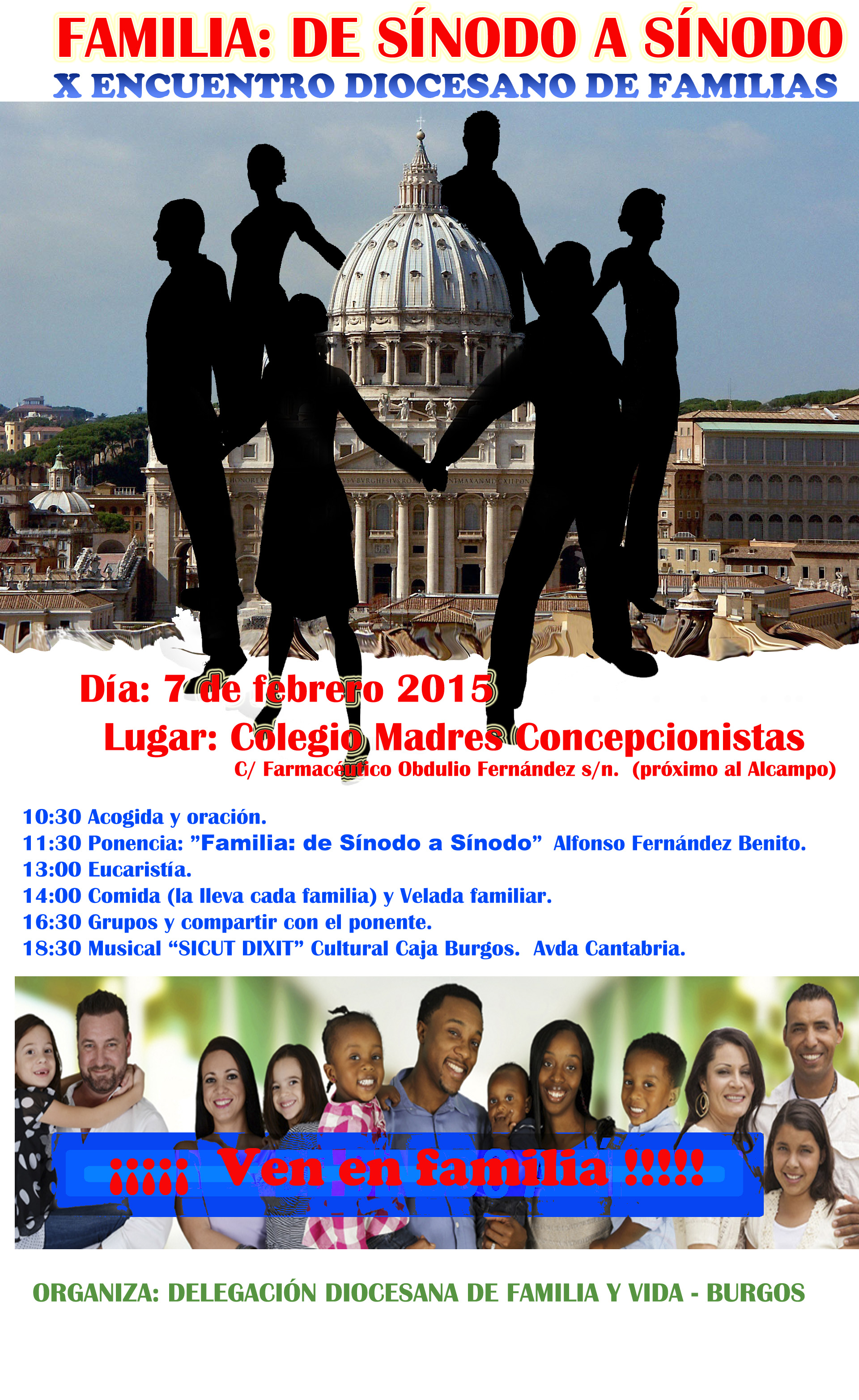 La Delegación Diocesana de Familia y Vida ha organizado el próximo sábado 7 de febrero el X Encuentro Diocesano de Familias. Tendrá lugar en el Colegio de las Madres Concepcionistas (C/. Farmacéutico Obdulio Fernández, 3) desde las 10:30h hasta las 18:00h. Entre otras actividades, habrá una charla sobre «Familia: de sínodo a sínodo«. Al terminar, a las 18:30, se podrá asistir al Musical «Sicut dixit» en el aula cultural de Caja Burgos (Avda. de Cantabria). Os dejamos aquí el folleto con información más detallada y la ficha de inscripción.