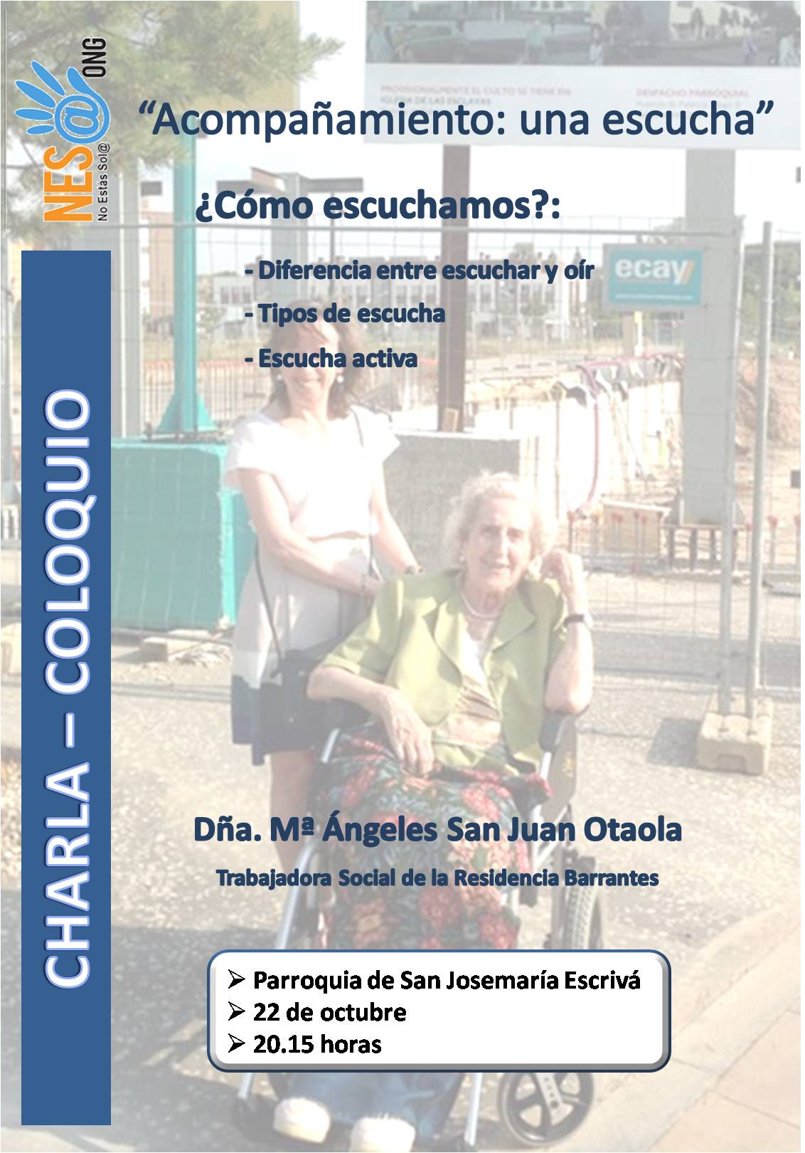 Este jueves, 22 de octubre, tendrá lugar D.m. en la parroquia, a las 20:15 horas, una charla-coloquio organizada por NES@ (No Estás Sol@), nuestra ong de acompañamiento a personas que sufren soledad.Será impartida por Dña. Mª Ángeles San Juan Otaola, Trabajadora Social de la residencia Barrantes, bajo el título «Acompañamiento: una escucha» y estará centrada en aprender a escuchar a los demás.