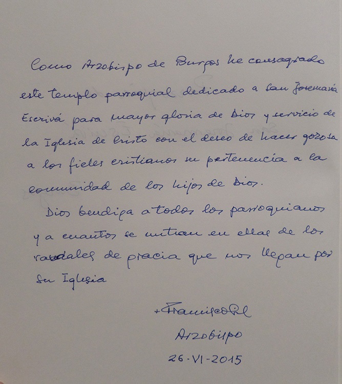 Acompañamos el texto que D. Francisco nos dejó en el libro de firmas de la parroquia el día de la Dedicación del nuevo Templo.