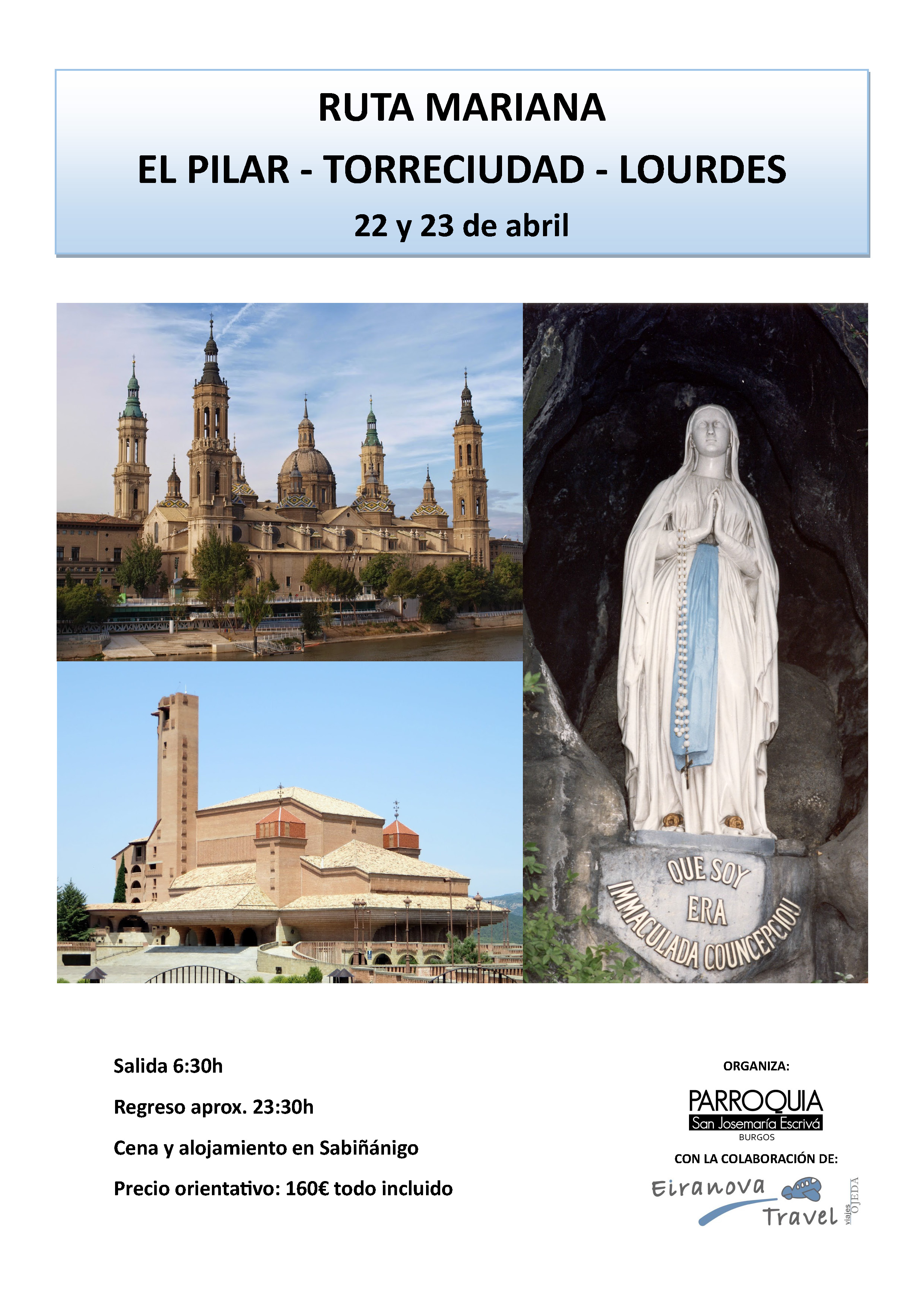 Os adjuntamos información de la próxima salida a tres Santuarios Marianos, dentro de la conocida Ruta Mariana, que nos ayudará a preparar muy bien el próximo mes de mayo. La salida está prevista para el 22 de abril a las 6:30h y el regreso a las 23:30h aprox. del domingo 23 de abril.