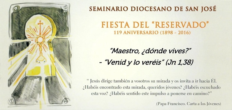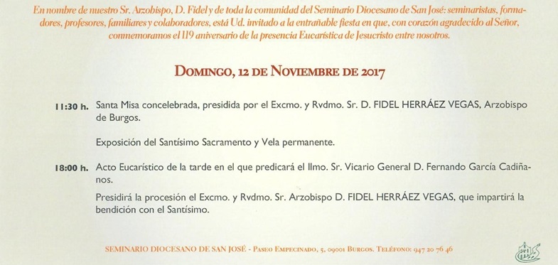 Este Domingo 12 de Noviembre, Nuestro Arzobispo, Don Fidel nos invita a esta fiesta en la que el Seminario conmemora un nuevo aniversario -el 119- de la Presencia Eucarística de Jesucristo en su sede. Comienza a las 11:30h con la Santa Misa concelebrada que presidirá Don Fidel, a continuación habrá Exposición del Santísimo Sacramento y Vela permanente. A las 18:00h se celebrará un acto Eucarístico y a continuación la Procesión al final de la cual nuestro Arzobispo impartirá la Bendición con el Santísimo.