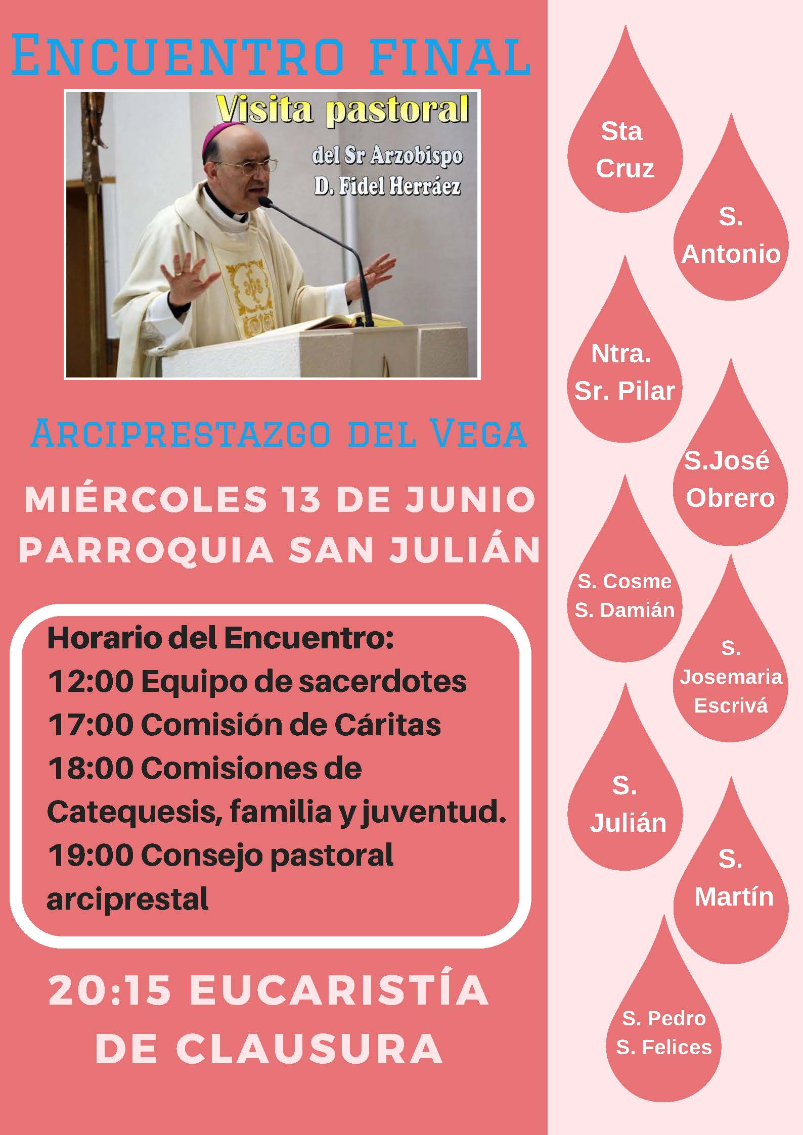 El próximo miércoles 13 de junio se celebrará la clausura de la Visita Pastoral de don Fidel al Arciprestazgo de Vega. Tendrá lugar en la parroquia de San Julián. Después de una reunión con el Consejo Arciprestal celebrará la Eucaristía de clausura a las 20:15h, acompañado de los Sacerdotes del Arciprestazgo y de los feligreses de las 9 parroquias que integran el Arciprestazgo. En el cartel anunciador podéis ver más detalles. Estáis todos invitados.