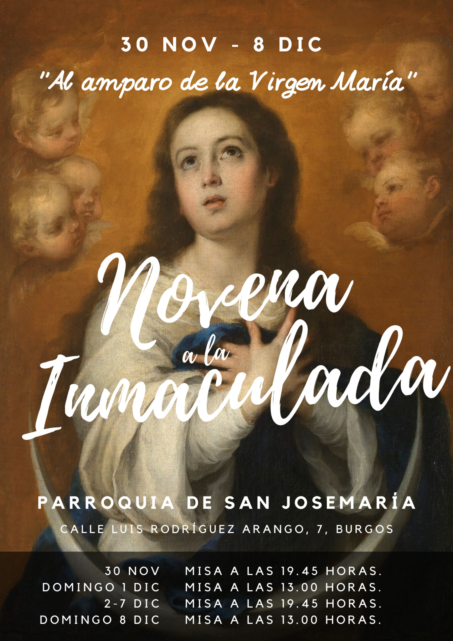 Este sábado da comienzo la Novena a la Inmaculada, que se celebra en todas las misas, si bien, de modo especial los días laborables en la misa de 19:45h y los festivos en la de 13:00h, que predicará d. César Alonso de Porres, Canónigo Emérito de la S.I. Catedral.