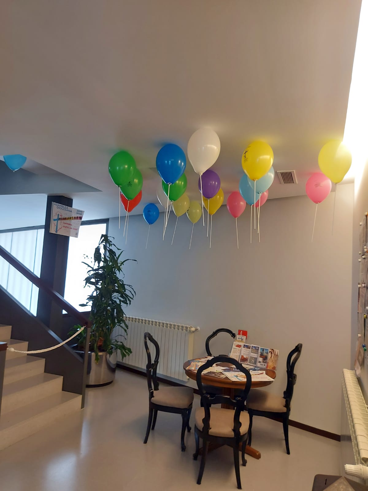 Para dar mayor visibilidad a la Fase final de la Asamblea Diocesana que comienza el próximo sábado 5, hemos puesto unos globos en la entrada al hall de las aulas de catequesis.