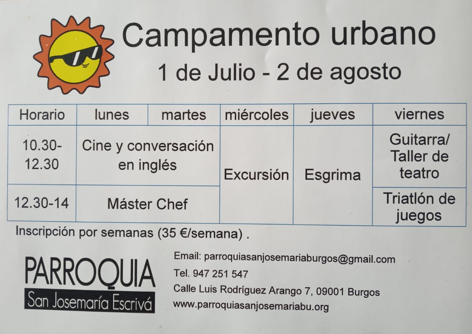 Como estaba previsto, un año más se han iniciado las actividades del campamento urbano, en el que ya tenemos cierta experiencia. La primera semana, tuvieron especial interés las clases de esgrima y la primera excursión con la visita al Monasterio de las Huelgas. Esta semana, el Masterchef ha acaparado el interés de los asistentes, además de las sesiones de familiarización con la lengua inglesa, a través de conversaciones y películas.