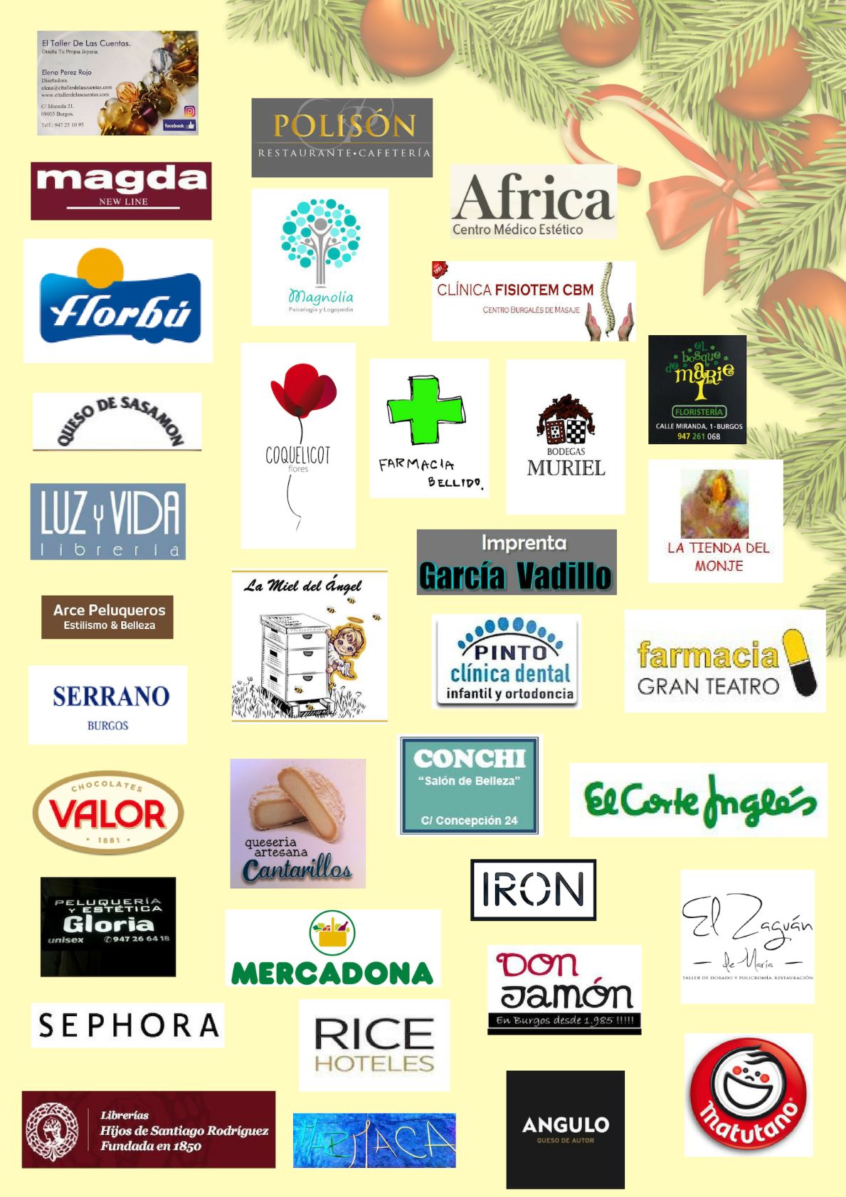 Agradecemos a cuantos han colaborado al éxito de este segundo «Mercadillo Navideño» de nuestra parroquia. Han sido muchas las personas que por este motivo han pasado por nuestra sede, conociendo nuestra iglesia y nuestras actividades, tanto de culto como las dirigidas a familias y jóvenes. Además ha supuesto una ayuda para la financiación del templo que vamos amortizando (ver foto de las empresas y entidades que han colaborado)